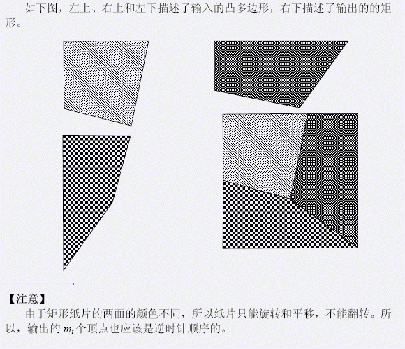 工作不感兴趣了,所以,他找到了你,希望你能够告诉他,这些凸多边形纸片能不能够拼成矩形。