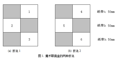 眼镜盒的特别之处在于它有两种折法。图1的(a)和(b)就是它的两种折法,第一种折法把区域1,2,3暴露在盒子的