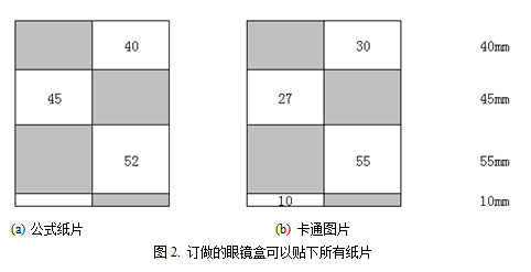 纸片。标准的眼镜盒长度为150,宽度为55,面积为8250,分为长度相等的三个纸带,因此每个白色区域的尺寸为5