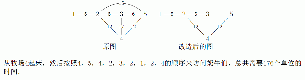 Farmer John变得非常懒, 他不想再继续维护供奶牛之间供通行的道路. 道路被用来连接N (5 <= N <= 10,000)个牧场, 牧场被连续地编号为1..N. 每一个牧场都是一个奶牛的家. FJ计划除去P(N-1 <= P <= 100,000)条道路中尽可能多的道路, 但是还要保持牧场之间的连通性. 你首先要决定那些道路是需要保留的N-1条道路. 第j条双向道路连接了牧场S_j和E_j (1 <= S_j <= N; 1 <= E_j <= N; S_j != E_j), 而且走完它需要L_j (0 <= L_j <= 1,000)的时间. 没有两个牧场是被一条以上的道路所连接. 奶牛们非常伤心, 因为她们的交通系统被削减了. 你需要到每一个奶牛的住处去安慰她们. 每次你到达第i个牧场的时候(即使你已经到过), 你必须花去C_i (1 <= C_i <= 1,000)的时间和奶牛交谈. 你每个晚上都会在同一个牧场(这是供你选择的)过夜, 直到奶牛们都从悲伤中缓过神来. 在早上起来和晚上回去睡觉的时候, 你都需要和在你睡觉的牧场的奶牛交谈一次. 这样你才能完成你的交谈任务. 假设Farmer John采纳了你的建议, 请计算出使所有奶牛都被安慰的最少时间. 对于你前10次的提交, 你的程序会在一部分正式的测试数据上运行, 并且返回运行的结果.