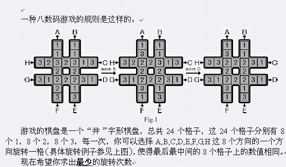游戏的棋盘是一个“井”字形棋盘,总共24个格子,这24个格子分别有8个1,8个2,8个3,每一次,你可以选择A,B,C,D,E,F,G,H这8个方向的一个方向旋转一格(具体旋转例子参见上图),使得最后最中间的8个格子上的数值相同。 现在希望你求出最少的旋转次数