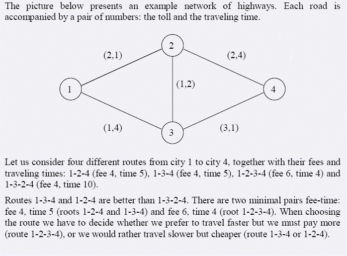 来越多,因此选择最佳路径是很现实的问题。城市的道路是双向的,每条道路有固定的旅行时间以及需要支付的费用。路径由连续的道路组成。总时间是各条道路旅行时间的和,总费用是各条道路所支付费用的总和。同样的出发地和目的地,如果路径A比路径B所需时间少且费用低,那么我们说路径A比路径B好。对于某条路径,如果没有其他路径比它好,那么该路径被称为最优双调路径。这样的路径可能不止一条,或者说根本不存在。 给出城市交通网的描述信息,起始点和终点城市,求最优双条路径的条数。城市不超过100个,边数不超过300,每条边上的费用和时间都不超过100。