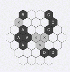 A civil engineer that has recently graduated from the Czech Technical University encountered an interesting problem and asked us for a help. The problem is more of economical than engineering nature. The engineer needs to connect several buildings with an infrastructure. Unfortunately, the investor is not the owner of all the land between these places. Therefore, some properties have to be bought first. The land is divided into a regular ``grid" of hexagonal parcels, each of them forms an independent unit and has the same value. Some of the parcels belong to the investor. These parcels form four connected areas, each containing one building to be connected with the others. Your task is to find the minimal number of parcels that must be acquired to connect the four given areas. The whole land also has a hexagonal shape with six sides, each consisting of exactly H parcels. The above picture shows a land with H = 4 , parcels with letters represent the four areas to be connected. In this case, it is necessary to buy four additional parcels. One of the possible solutions is marked by crosses.