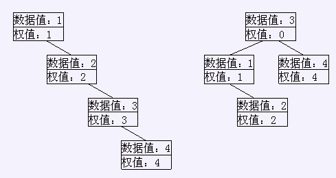 输入的原图是左图,它的访问代价是1×1+2×2+3×3+4×4=30。最佳的修改方案是把输入中的第3个结点的权值改成0,得到右图,访问代价是1×2+2×3+3×1+4×2=19,加上额外修改代价10,一共是29。