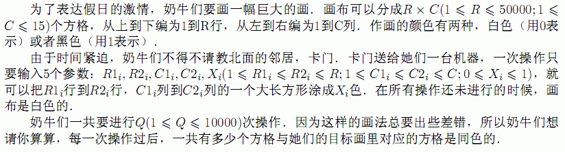 第1行输入R,C,Q.接下来输入R行C列的目标画.之后Q行一行输入一次操作的5个参数.