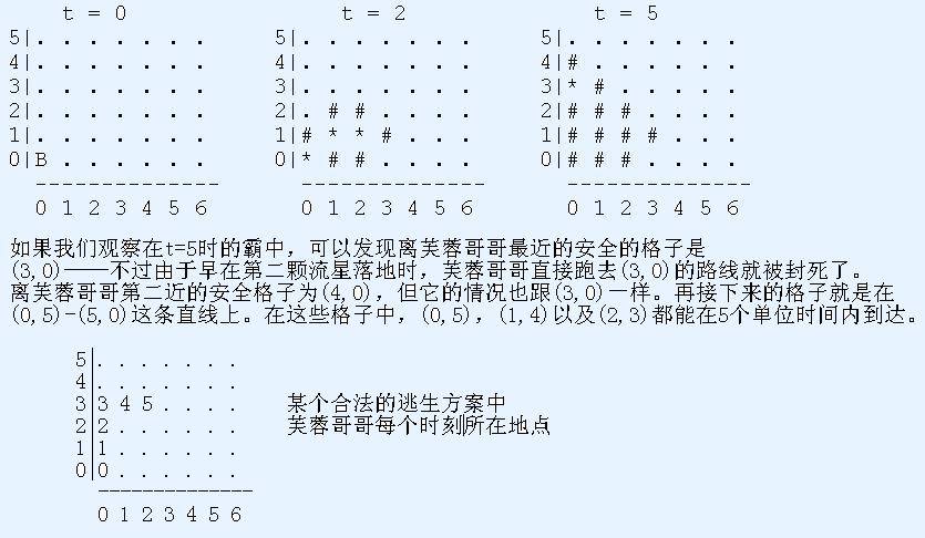 输出1个整数,即芙蓉哥哥逃生所花的最少时间。如果芙蓉哥哥无论如何都无法在流星雨中存活下来,输出-1