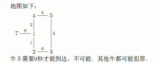 A crime has been comitted: a load of grain has been taken from the barn by one of FJ's cows. FJ is trying to determine which of his C (1 <= C <= 100) cows is the culprit. Fortunately, a passing satellite took an image of his farm M (1 <= M <= 70000) seconds before the crime took place, giving the location of all of the cows. He wants to know which cows had time to get to the barn to steal the grain. Farmer John's farm comprises F (1 <= F <= 500) fields numbered 1..F and connected by P (1 <= P <= 1,000) bidirectional paths whose traversal time is in the range 1..70000 seconds (cows walk very slowly). Field 1 contains the barn. It takes no time to travel within a field (switch paths). Given the layout of Farmer John's farm and the location of each cow when the satellite flew over, determine set of cows who could be guilty. NOTE: Do not declare a variable named exactly 'time'. This will reference the system call and never give you the results you really want.