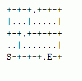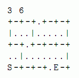 给出一个城市地图,东西街区E(1≤E≤40),南北街区N(1≤N≤30).制作一个开车指南给出租车司机,告诉他如何从起点(用S表示)到终点(用E表示).每一个条目用空格分成两部分,第一个部分是方向(N,E,S,W之一),第二个是一个整数,表示要沿着这个方向开几个十字路口.如果存在多条路线,你应该给出最短的.数据保证,最短的路径存在且唯一. 地图中“+”表示十字路口,道路用“I”和“一”表示.建筑和其他设施用“.”表示.下面是一张地图:
