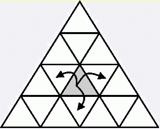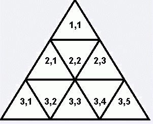 迷宮的第i行有2*i-1個三角形,從左到右分別編號為(i,1)、(i,2)等等。 貝希每次可以從一個三角形走到任意一個一個跟當前的三角形有鄰邊的三角形。比如說,如果她目前處於三角形(3,3),那麼,她可以走到三角形(3,2)、(3,4)和(4,4)。貝希每次需要一分鐘的時間來移動到下一個三角形。