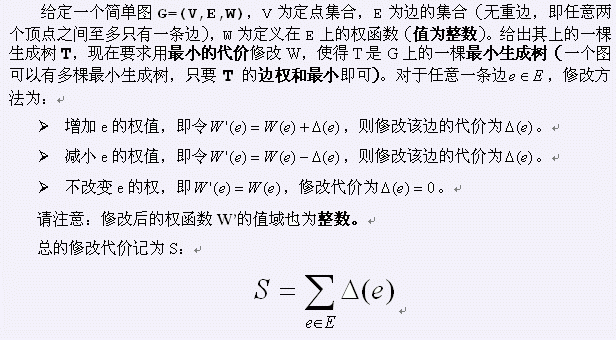 第一行为N、M,其中 表示顶点的数目, 表示边的数目。顶点的编号为1、2、3、……、N-1、N。接下来的M行,每行三个整数Ui,Vi,Wi,表示顶点Ui与Vi之间有一条边,其权值为Wi。所有的边在输入中会且仅会出现一次。再接着N-1行,每行两个整数Xi、Yi,表示顶点Xi与Yi之间的边是T的一条边。