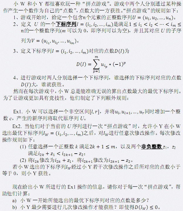 输入数据包含两组测试数据。 在第一组测试数据中: 第一次“拼点游戏”时,最优下标序列为(1,2,4,5),小 Y只需要进行一次修改操作:选择 k=1,以及非负整数 z1=1,z2=0。这样经过修改操作之后下标序列将变为(1,3,4,5),小 Y获胜。 第三次“拼点游戏”时,序列 U为(9,8,6,5,3),小 W所选择的最优下标序列为空序列,所产生的点数为 0。在这种情况下,小Y无法进行任何修改操作(也无需进行任何修改操作) ,此时小 Y已经直接获胜。 对于10%的数据满足 n,q ≤ 13; 对于30%的数据满足 n,q ≤ 1000; 对于另外20%的数据满足 T=1 且 n ≤ 40000; 对于100%的数据满足 T ≤ 3 且 n, q ≤ 10^5 同时初始序列 U满足 0
