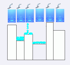 一天,陈启峰在洗衣服的时候突发奇想,发明了一种音乐水栅。音乐水栅是这样子的:它的下部是N个长方体的音乐木块并列组成的。每个木块的长度都是1,而宽度可能各不相同。为了没有重复的音调,陈启峰使得任意两块的高度都不相同。水栅前后被两块极大的玻璃夹着。在每一个音乐木块的中央上都有一个水龙头。当把它开启后,水就会掉下来,与木块发生非弹性碰撞时发出轻脆、优雅、动听的声音。下图为正视图: (1)当水流滴到一个没有水的木块上,就会分成相同的两部分往左右两个方向流去。比如在上图的第三块木块放水: 水由于重力都流到第二块和第四块上。(2)当水滴到水上,就会与水融为一体。譬如当水滴到第二块上,水积累到一定程度后,就会流到第四块木块上。现在陈启峰编写了一个音乐谱。该谱按时间前后顺序分成一个一个的M个命令,每一个命令都是“在第Wi个木块上注入体积为Vi的水”。但是陈启峰是一个不爱浪费的人,所有他想知道这音乐谱左边和右边各浪费了多少水。有必要的话,他可是要改谱哦。