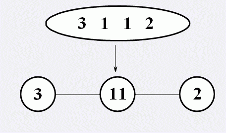 首先,细胞会经历一次分裂。细胞将沿躯干方向分裂成若干个球体,躯干将退化成丝状物,连接着相邻的球体。在分裂过程中,质量是均匀分布的。换句话说,若分裂成k个球体,每个球体的质量为原来的1/k。然而,密码的分布是不确定的。若分割成k个球体,密码会被切割成k段(每段长度至少为1),并按从头到尾的顺序分布在各个球体中。如图,为其中一种合法的一次分裂: