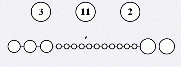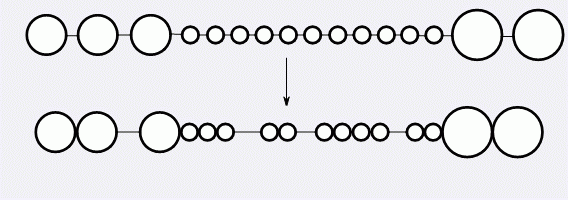 接下来,细胞会经历二次分裂。对于每个球体,其中会含有一小段密码(注意他是有序的),我们把它看作一个十进制的数T。这个球体会被分割成T个小球体,并排成一排,之间用躯干退化成的丝状物相连接,并且质量仍然是均匀分布的,每个小球体的质量都是原球体的1/T。至此,密码已经发挥了它的作用,便消失了。如图,为二次分裂: