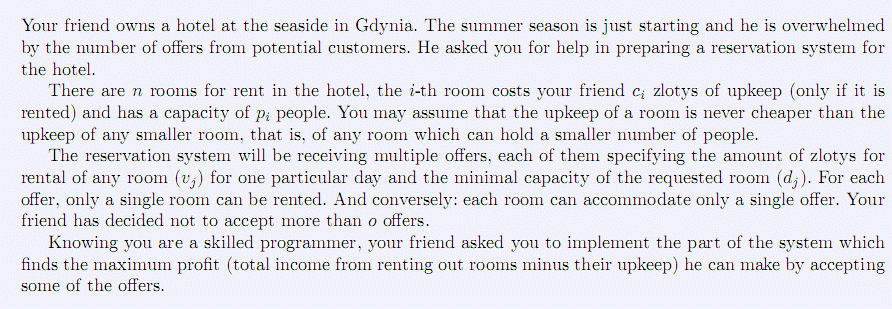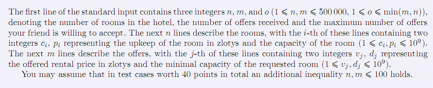 一个宾馆有n个房间和m个预订,每个房间有住过之后的维护费用c和最     大入住人数p,每个预订有收入v和人数d,大房间的维护费用不会比小房间的低,问   你最多接受o个预订的情况下的最大盈利