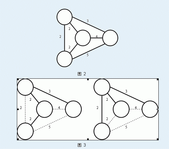 Secsa最近对最小生成树问题特别感兴趣。他已经知道如果要去求出一个n个点、m条边的无向图的最小生成树有一个Krustal算法和另一个Prim的算法。另外,他还知道,某一个图可能有多种不同的最小生成树。例如,下面图 3中所示的都是图 2中的无向图的最小生成树: