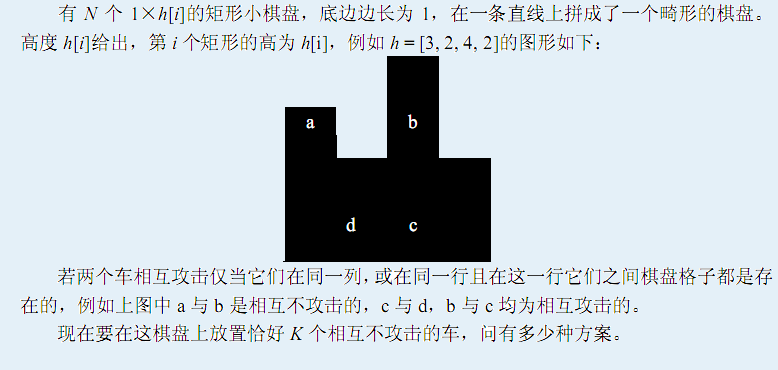 第1行包括两个正整数N,K,表示了棋盘的列数和放的车数。