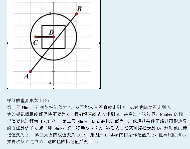 一天Blinker醒来,发现自己成为了一个二维世界的点,而且被标记上了一个奇怪的值。 这个世界是由N个边界互不相交(且不相切)的图形组成,这里图形仅包括圆和凸多边形。每个图形还有一个权值。每次Blinker走进或走出某个图形时(相切时经过不算),Blinker的标记值就会被异或上那个值。 现在,我们记录了Blinker在这个世界的M天的信息。每天可能发生两种事情,一种是某个图形的权值更改为某个值;另一种是Blinker从某个点走到另一个点。 我们假设Blinker首次出发前的标记值为0,我们希望知道他每次到达目的地后的标记