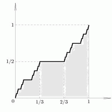 这个函数叫做康托函数(Cantor Function),是一个优美而又神秘的图形。人们发现他看似一个连续的不下降函数,但是函数的任意切线都是水平的。