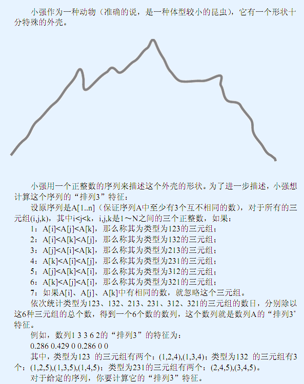 输出数列的排列3特征,一共6行,每行一个数,依次表示类型为123、132、213、231、312、321的三元组所占的比例。每个数精确到小数点后面20位,向下取整。