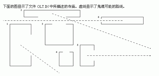 接下来的几行,你的程序应该按升序写下可能被鬼魂亵渎的寺庙编号。每一个编号占一行。如果没有编号,在文件OLT.OUT中,你应该写一个字符串:BRAK(波兰语中意思为“没有”)。