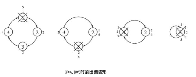 有编号从1nn个小朋友在玩一种出圈的游戏,编号为i+1的小朋友站在编号为i小朋友左边。编号为1的小朋友站在编号为n的小朋友左边。首先编号为1的小朋友开始报数,接着站在左边的小朋友顺序报数,直到数到某个数字K时就出圈。直到所有的小朋友都出圈,则游戏完毕。游戏过程如下图所示。