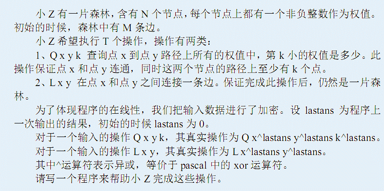 接下来 M行,每行包含两个整数x和 y,表示初始的时候,点x和点y 之间有一条无向边, 接下来 T行,每行描述一个操作,格式为“Q x y k”或者“L x y ”,其含义见题目描述部分。