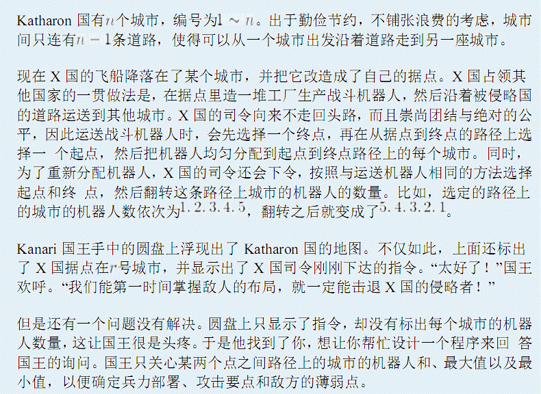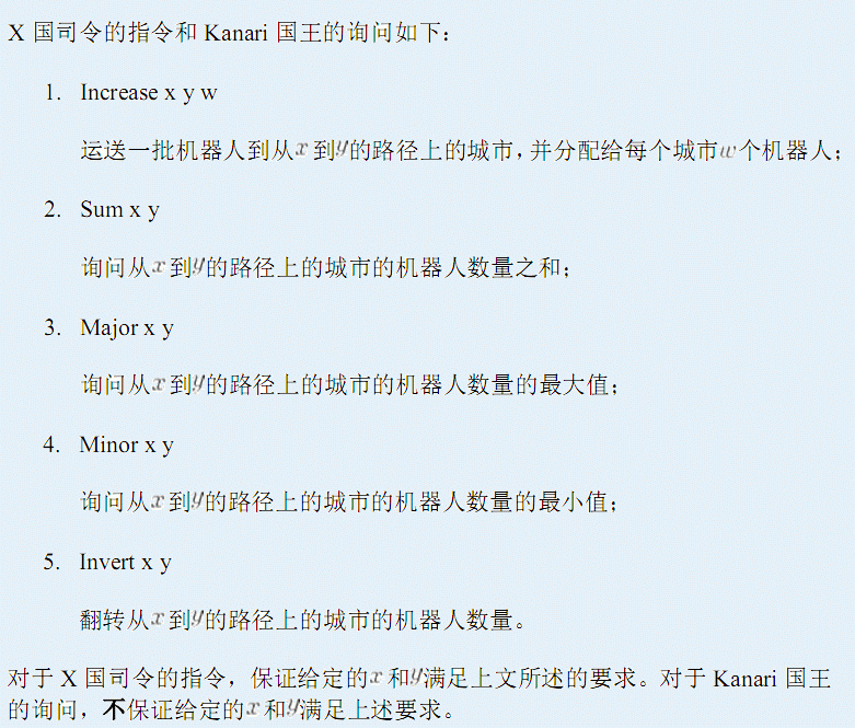 第一行有三个整数NMR,分别表示树的节点数、指令和询问总数,以及X国的据点。