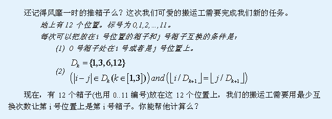 DescriptionInput输入数据由多组数据组成。 每一组数据由一行12个数构成Pi表示i号位置上的箱子编号。 Output 一个数,最少的交换次数。 Sample Input2 1 10 2 3 0 5 7 4 8 6 9 11 6 4 1 0 3 5 9 7 2 10 11 8 Sample Output8 9 数据约定: 数据组数不超过100。 对于每一组数据,对应的答案不会“非常大”HintSource