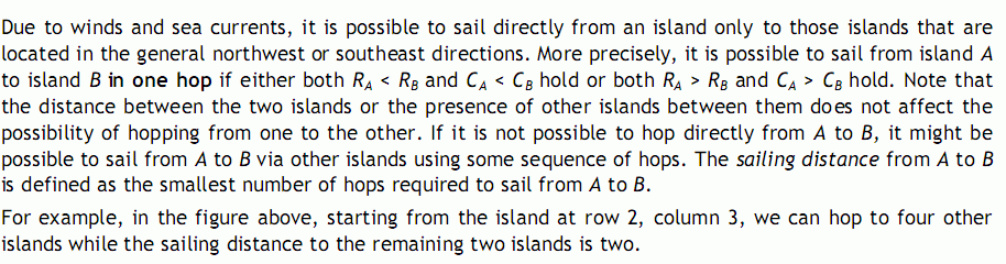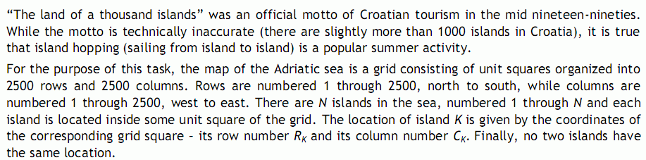 contain the locations of the islands. Each location is a pair of integers between 1 and 2500 (inclusive), the row and column numbers, respectively.