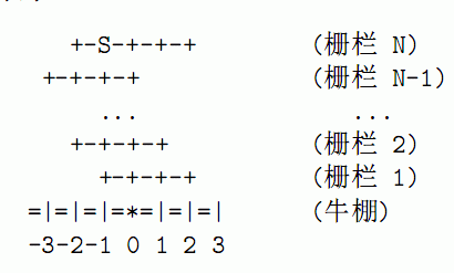 约翰建造了N(1≤N≤50000)个栅栏来与牛同乐.第i个栅栏的z坐标为[Ai.,Bi](-100000≤Ai<Bi≤10^5),y坐标为i.牛棚的外栏即x轴,原点是牛棚的门.奶牛们开始处于(S,N),她们需要回到牛棚的门(下图中用“*’表示).
