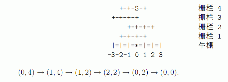 走.当她们走到栅栏的尽头,就会朝着牛棚的个栏方向(即y轴负方向)行走,直到碰上另一条栅栏或是牛棚外栏.这时候她们便要选择继续向左走,还是向右走.奶牛们希望走的路程最短.由于可方向的路程一定,你只需求出z方向走的最短路程,使奶牛回到原点.
