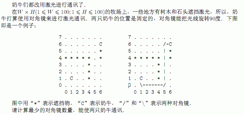 DescriptionInput 第1行输入w和H,之后W行H列输入地图,图上符号意义如题目描述. Output 最少的对角镜数量.Sample Input7 8 ....... ...... C ......* *****.* ....*.. ....*.. .C ..*.. .......Sample Output3HintSourceSilver