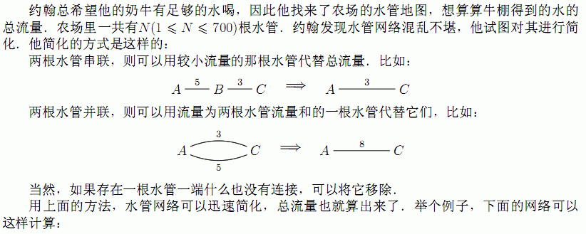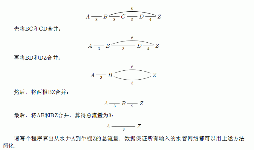 Description Input 第1行输入N,之后N行每行描述一条水管,前两个英文字母表示水管的两端(大小写字母是不一样的),后一个整数表示水管的流量,流量不会超过1000. Output 一个整数,表示总流量.Sample Input5 A B 3 B C 3 C D 5 D Z 4 B Z 6Sample Output3HintSourceSilver