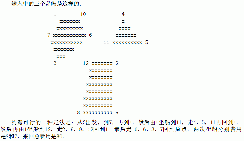 约翰在加勒比海买下地产,准备在这里的若干个岛屿上养奶牛.所以,他要给所有岛屿围上篱笆.每个岛屿都是多边形.他沿着岛屿的一条边界朝一个方向走,有时候坐船到另一个岛去.他可以从任意一个多边形顶点开始修篱笆的工作;在任意一个到达的顶点,他可以坐船去另一个岛屿的某个顶点,但修完那个岛的篱笆,他必须马上原路返回这个出发的岛屿顶点.任意两个顶点间都有肮线,每条航线都需要一定的费用.请帮约翰计算最少的费用,让他修完所有篱笆.