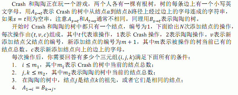 DescriptionInput 共N+1行。 第一行包含一个正整数N,表示操作的数目。 接下来有N行,每行包含两个个正整数T,V和一个小写英文字母C,表示一次操作,数据保证所有的操作都合法。 Output共N行,依次表示每次操作后满足条件的三元组个数。Sample Input5 1 1 a 2 1 a 1 2 b 2 1 b 2 3 a Sample Output1 3 3 4 7 HintSource