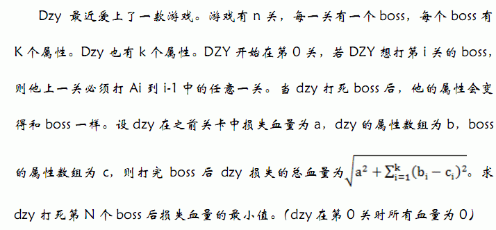 DescriptionInput第一行两个整数N,K. 接下来每行N个整数描述Boss的属性。 最后一行N个整数表示AiOutput仅一行,表示最少损失血量,保留三位小数 Sample Input1 2 1 1 0 Sample Output1.414 Hint N<=50000,K<=3 保证A1=0,其它所有Ai>0 属性值小于等于100,完全随机。 仅有三个测试点 Source