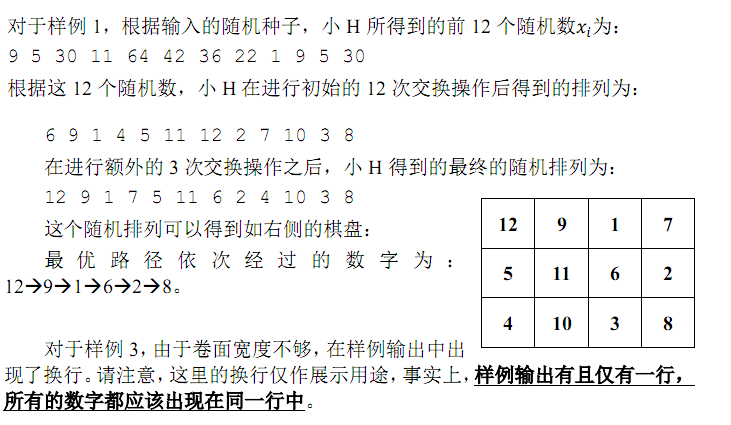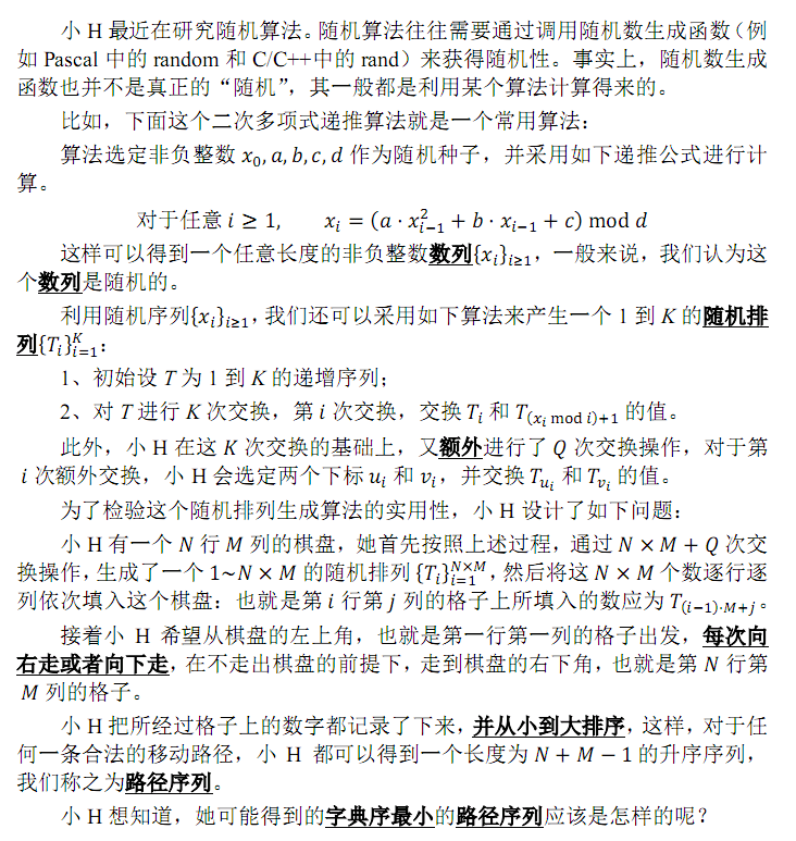 第1行包含5个整数,依次为 x_0,a,b,c,d ,描述小H采用的随机数生成算法所需的随机种子。第2行包含三个整数 N,M,Q ,表示小H希望生成一个1到 N×M 的排列来填入她 N 行 M 列的棋盘,并且小H在初始的 N×M 次交换操作后,又进行了 Q 次额外的交换操作。接下来 Q 行,第 i 行包含两个整数 u_i,v_i,表示第 i 次额外交换操作将交换 T_(u_i )和 T_(v_i ) 的值。