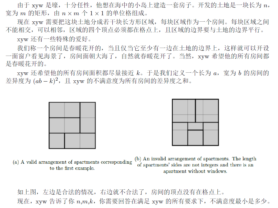 Description Input输入一行,三个整数,n, m, k Output输出一个数,表示最小不满意度。 Sample Input3 3 2Sample Output1 【Hint】 见描述中的左图的分割方案,最小不满意度为4 * (2 - 2) ^ 2 + (1 - 2) ^ 2 = 1。 【数据范围】 n, m <= 300 k <= 10000 HintSource鸣谢 Dzy