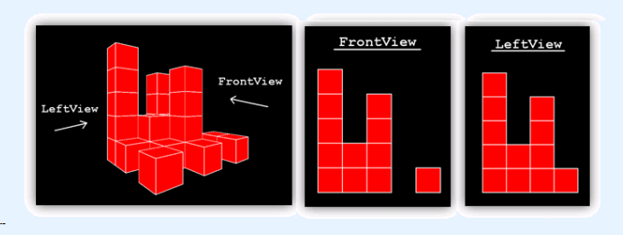 你将得到这个立体图形的左视图 (Left View) 和主视图 (Front View),求可能的立体图形数。