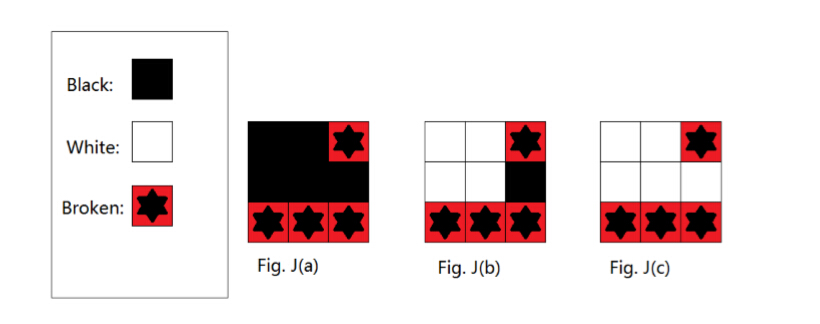 For example, N = 3 and there are 4 broken cells as shouwn in Fig. J(a). There are 2 painting schemes for i=2 as shown in Fig. J(b) and J(c).