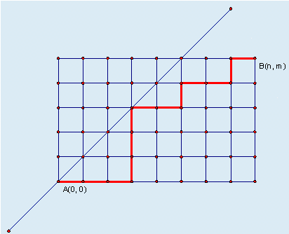 某城市的街道呈网格状,左下角坐标为A(0, 0),右上角坐标为B(n, m),其中n >= m。现在从A(0, 0)点出发,只能沿着街道向正右方或者正上方行走,且不能经过图示中直线左上方的点,即任何途径的点(x, y)都要满足x >= y,请问在这些前提下,到达B(n, m)有多少种走法。
