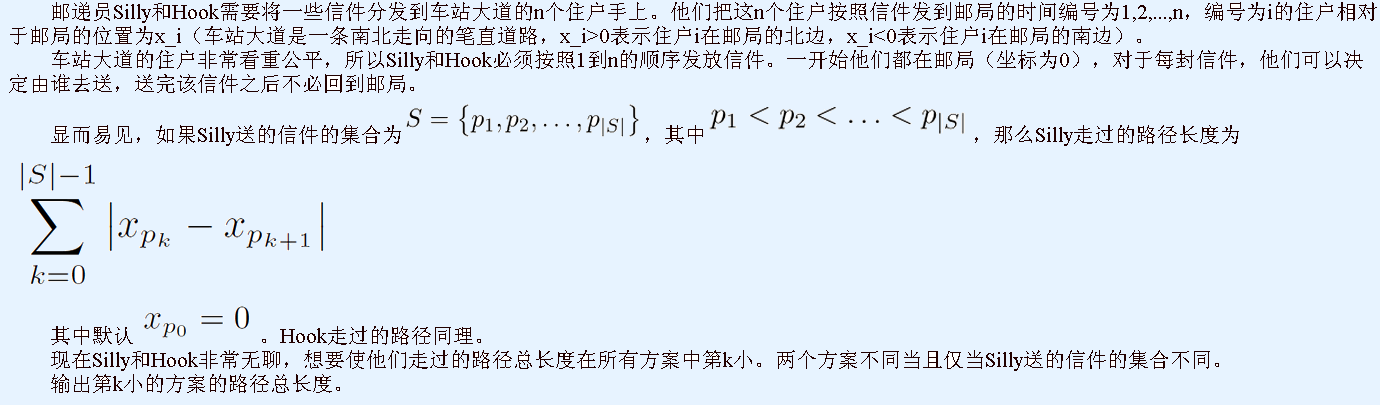 Description Input第一行两个整数n, k,意义如问题描述。 接下来n行,每行一个整数x_i。 Output一行一个整数,表示第k小的方案的路径总长度。数据保证至少存在k个方案。 Sample Input5 11 1 -1 2 -2 3Sample Output11HintN<=10000,K<=500000,|X_i|<=100000000 Source2014年国家集训队十五人互测