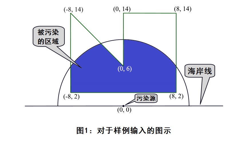 你计算所使用的模型已经在图1中被说明。海岸线(图1中的水平直线)为x轴,污染源位于原点(0, 0)。污染的蔓延呈半圆形,多边形代表了被波及的生态系统。你需要计算出生态系统被污染的面积,也就是图中深蓝色部分。