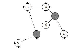 下面的图中。黑点代表开着的洞,节点1是源点,节点7是汇点。黑点在圆上的位置没有意义,仅作说明用途)。