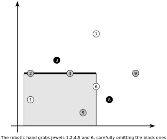 卢平发明了一种装置:一个巨大的机械臂,可以用来抢欧文的珠宝而不被任何报警设备发现。这只机械臂可以做一次抢的操作(也仅有一次)可以将在某条水平线段及其下方的所有珠宝拿走(如图)。卢平很容易偷走所有的珠宝,但是他知道,他拿得越多就越难不被发现。他决定选择一种安全的方案,他拿走的珠宝的颜色数不会超过k。