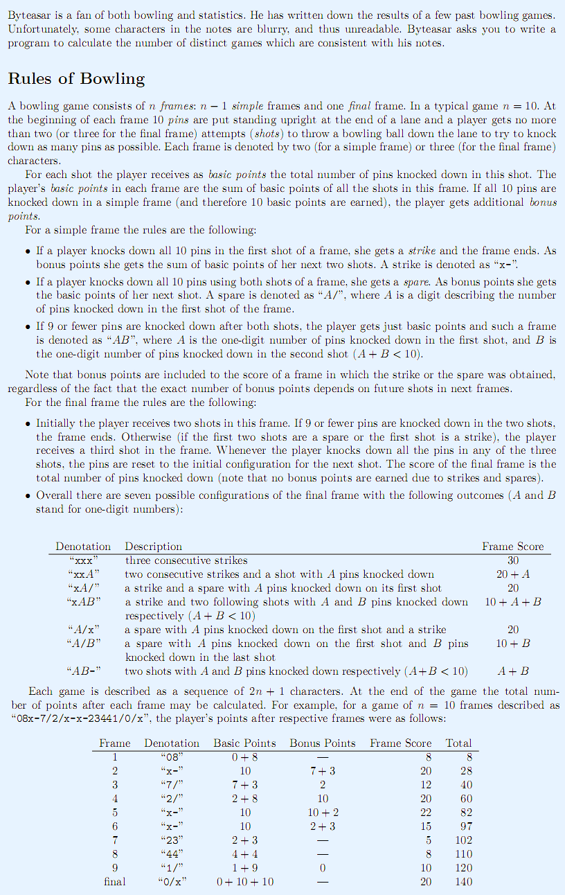 Explanation to the example: In the first case, in frame 5 after the character "x" the only possible character is "-". In frame 8 the player got 8 points in total. Thus there are 9 possibilities how this sum could have been obtained:0+8,1+7,….8+0. There were no bonus points in frame 9. Therefore, there were no points on the first shot of the final frame. To obtain 20 points in the last two shots, the only possibility is a spare with a following strike in the last shot of the frame. Therefore there are 9 different valid games which correspond to this input data.