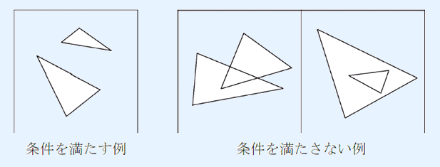 两个三角形没有公共点(包括内部和边界)。换言之,两个三角形之间既不相交,也不存在某个三角形包含另一个三角形。