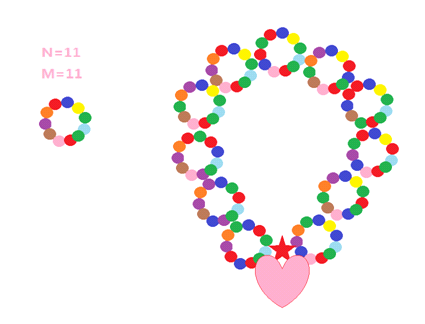 这则故事的真实性到今天已经没有意义了,然而我们关注的是那一条精美的爱之项链。这是一条由N个精致的戒指与一块特殊纪念品相连而成的环形,如下图中的爱心符号正是一种特殊纪念品。(据说是2012年情人节时zyg特意托人订制的)上面的每一枚戒指又是由M个带磁性的特殊彩色球状物组成的环形。也许你会认为,这所谓的戒指,更像是一条条小项链。