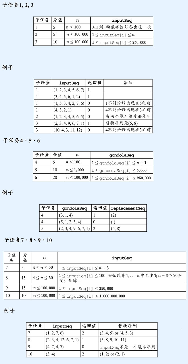 你喜欢去缆车站上观察缆车过站。一个缆车序列( gondola sequence ) 是由缆车过站次序形成的n个缆车编号的序列。在你到达缆车站之前,有可能会有一到多个缆车发生故障(并且被替换掉),但是在你观察过程中是不会有缆车发生故障的。